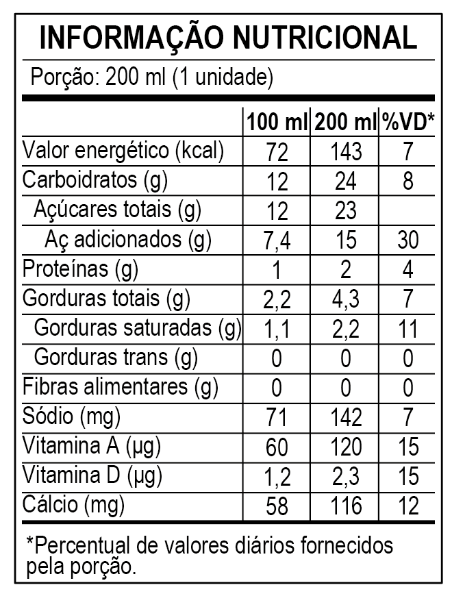 Soro de leite e/ou soro de leite em pó reconstituído, leitelho, açúcar, creme de leite, leite integral e/ou leite em pó integral reconstituído, amido modificado, cloreto de sódio, vitaminas A e D, aromatizantes, espessantes goma guar, goma gelana, carboximetilcelulose sódica, goma xantana, corante cochonila e estabilizantes fosfato trissódico, hidrogenofosfato de di-sódio e citrato trissódico.