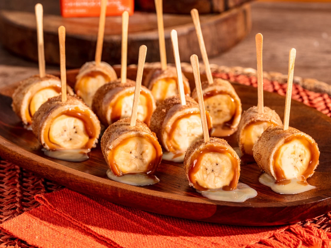 - Prenda com um palito e passe na mistura de açúcar com canela.