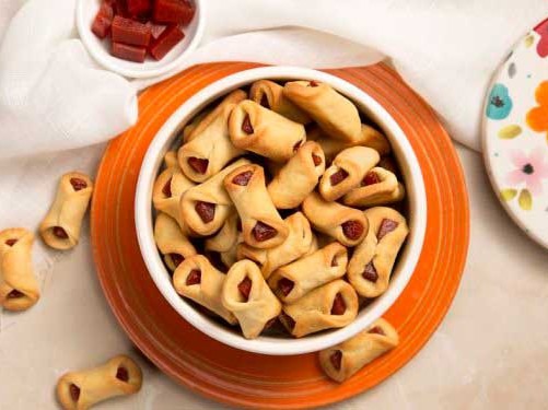 - Abra a massa com um rolo. Use um cortador ou um copo para cortar no formato redondo e no meio de cada círculo coloque um pedacinho de goiabada. Una as pontas em cima, apertando suavemente;