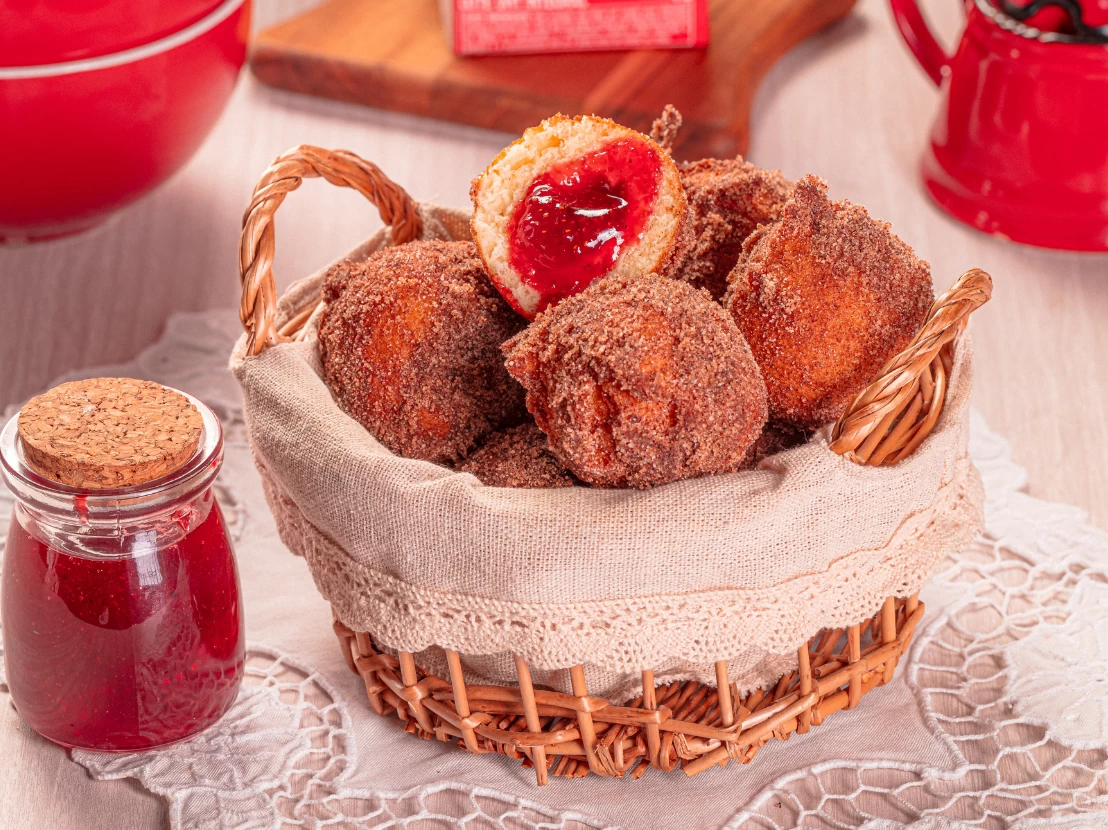 - Retire do fogo quando estiver no ponto, depois misture a canela com açúcar e salpique no bolinho de chuva já frito. Sirva com a geleia de morango.