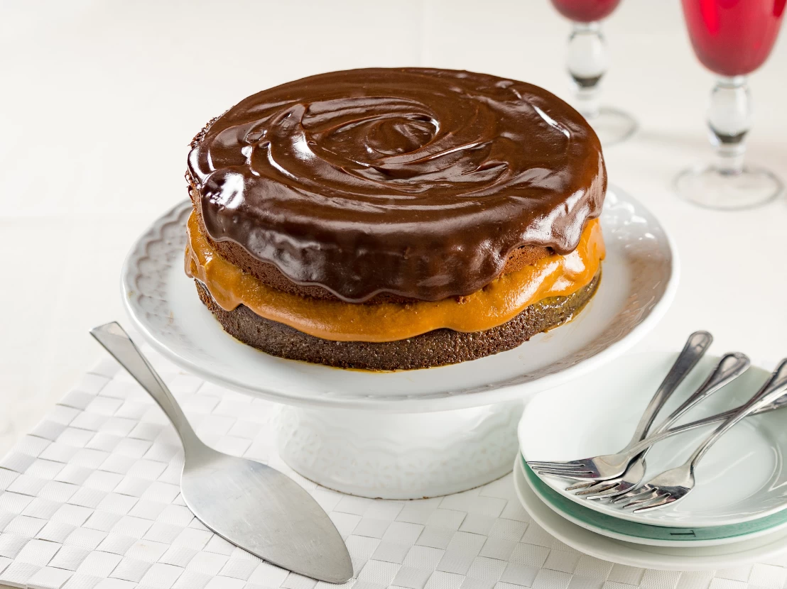 - Sobre 1 dos discos de massa, espalhe o recheio de doce de leite, formando uma camada de aproximadamente 1-2 dedos de espessura;