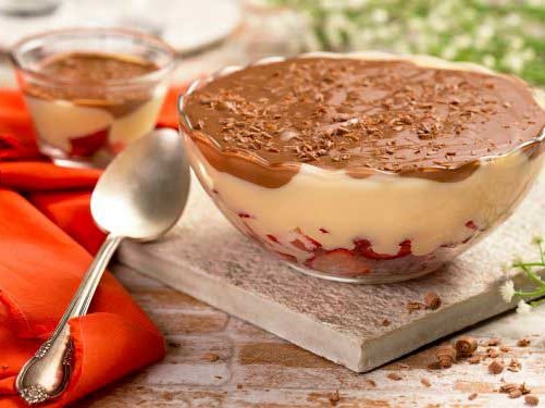 - Cubra o fundo de uma travessa com os morangos e coloque o brigadeiro branco por cima e, por último, coloque o creme trufado. Decore o doce com morangos e raspas de chocolate zero lactose e, para finalizar, sirva gelado.