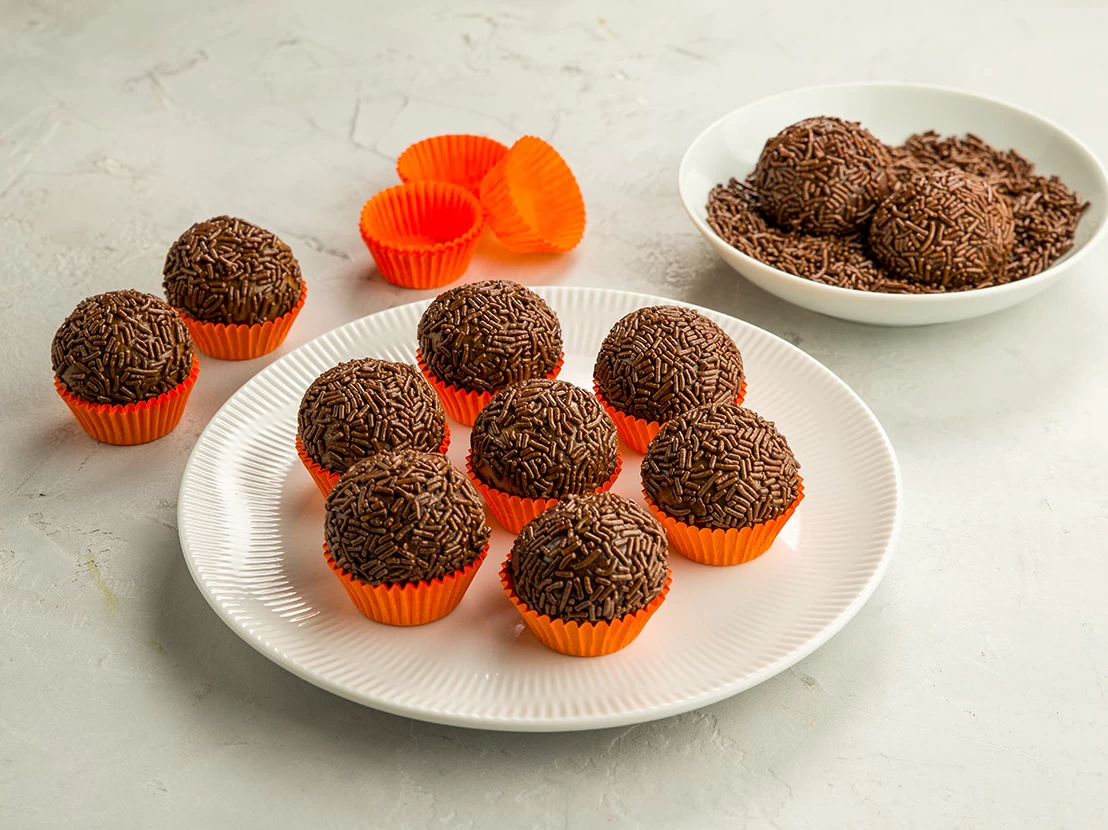 - Envolva os brigadeiros nos confeitos e sirva (caso não tenha confeitos zero lactose, envolva os brigadeiros com açúcar de confeiteiro ou cacau em pó).