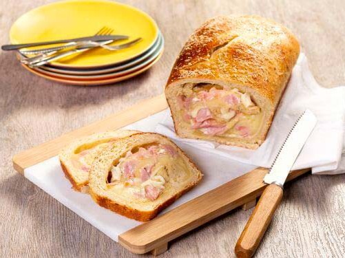 - Coloque o queijo e presunto e adicione a outra metade da massa por cima. Polvilhe com queijo ralado;