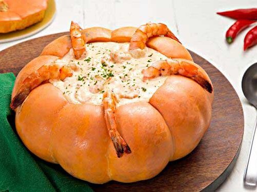 - Recheie a moranga com o creme de camarão e leve ao forno por 10 a 15 minutos para aquecer e sirva a seguir.