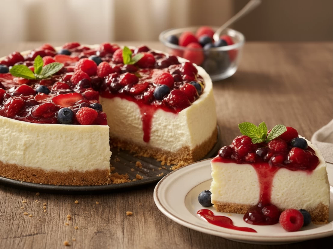 Cheesecake Assado de Leite Condensado com Calda de Frutas Vermelhas