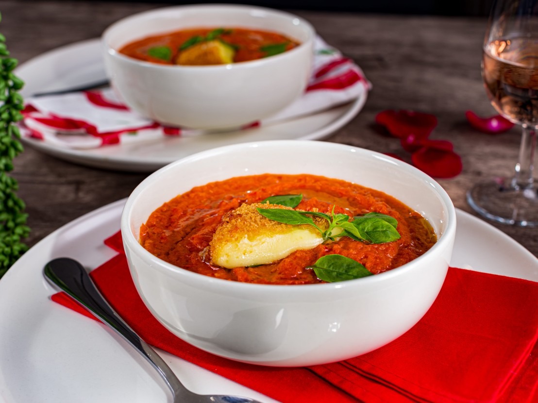 Creme de tomates com queijo empanado