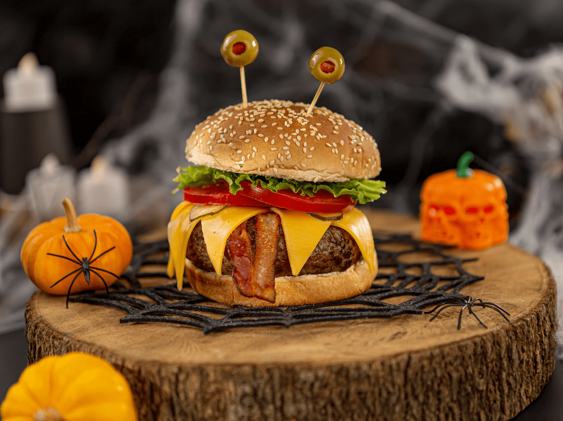 - Monte o monstrinho com o hambúrguer, alface, cebola caramelizada, pepino em conserva, queijo prato fatiado e tomate. Complemente com mistura de requeijão e amido;