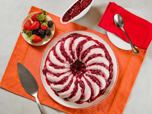 4. Desinforme o manjar e decore com morangos picados e frutas vermelhas. Sirva.