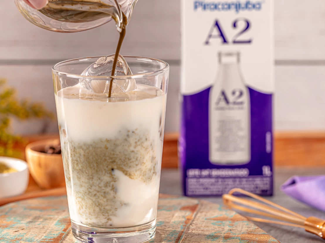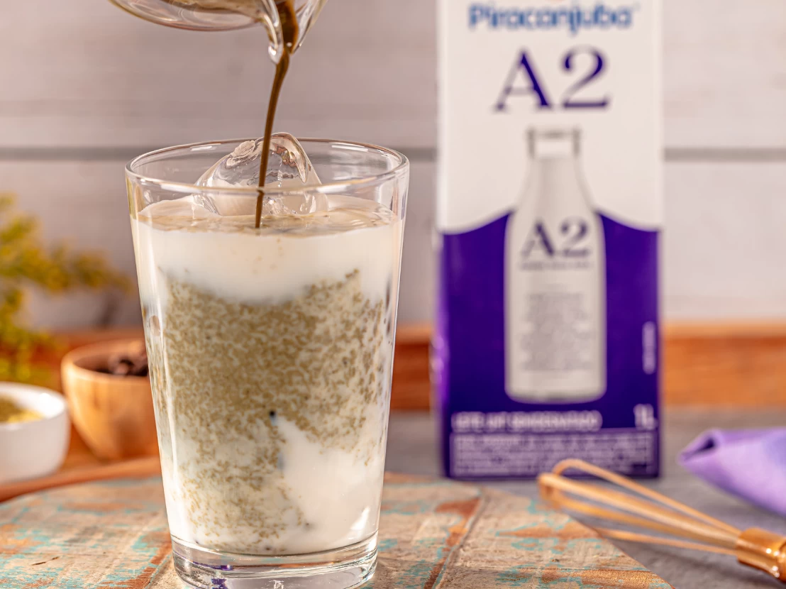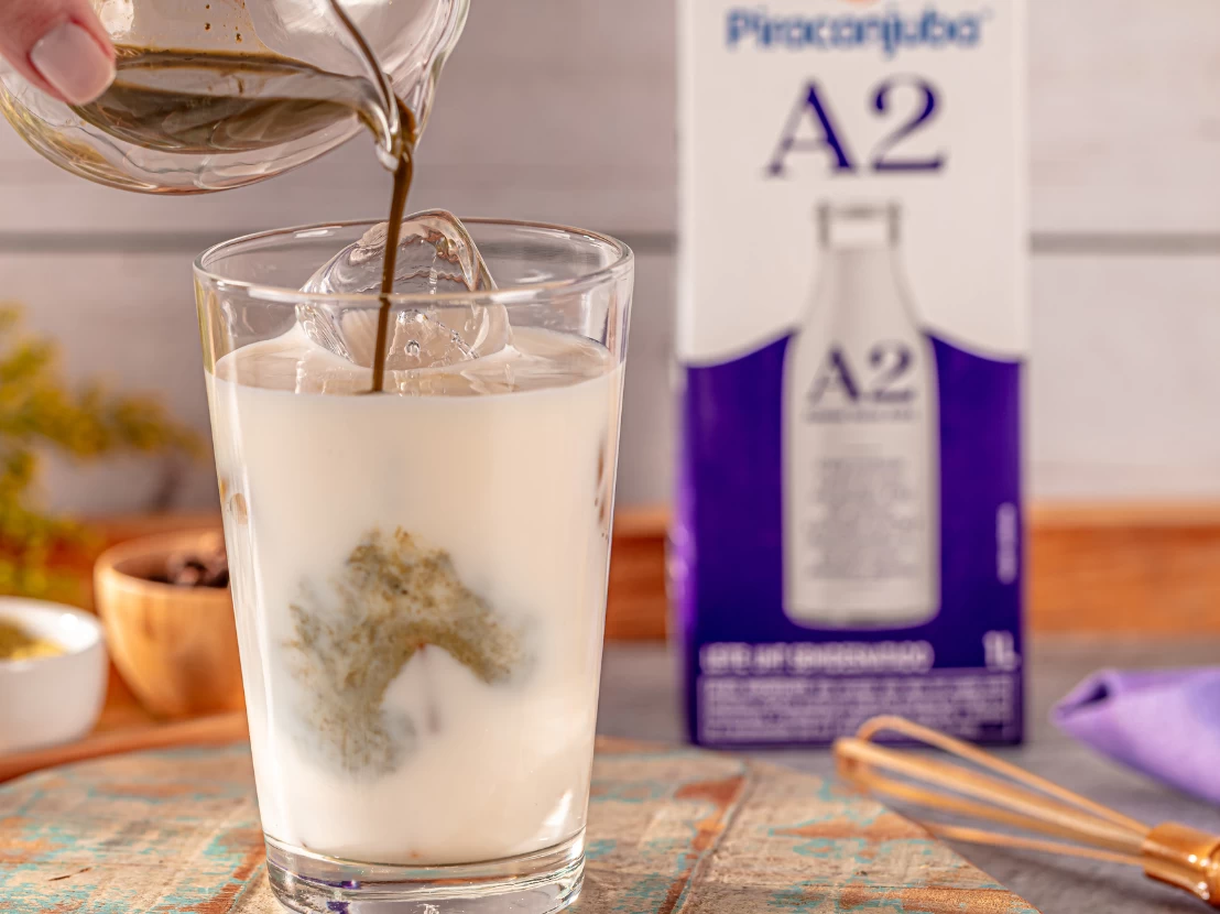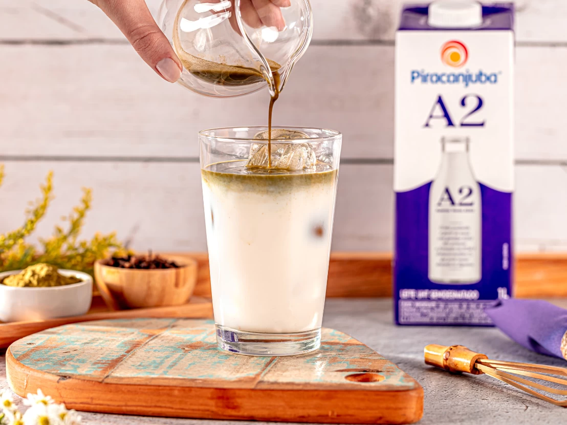 - Insira o leite na mistura de matcha e polvilhe canela em pó por cima se gostar.