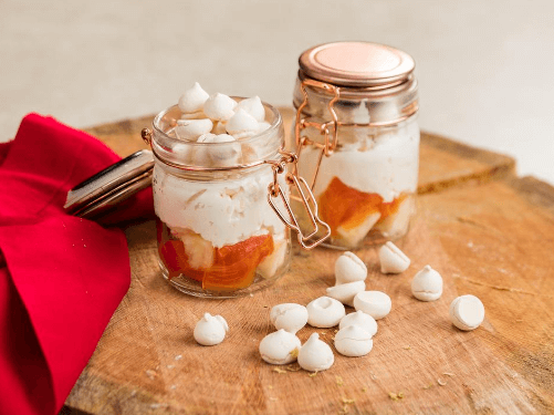 - Em um recipiente grande e alto de vidro ou em potes individuais, faça camadas com o chantilly, as frutas picadas e os suspiros, alternando. Finalize com alguns pedaços de frutas e suspiros para decorar;