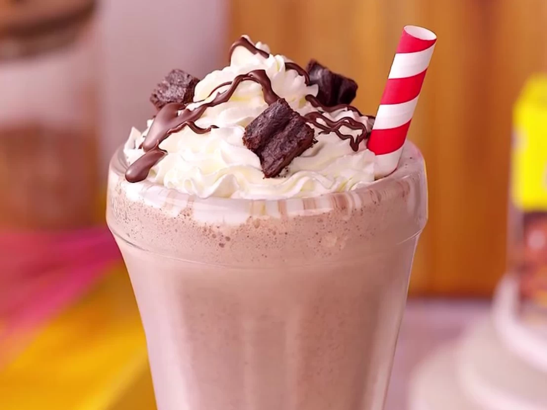 - Sirva o milkshake em um copo, coloque o chantilly, pedaços de brownie e a calda de chocolate.