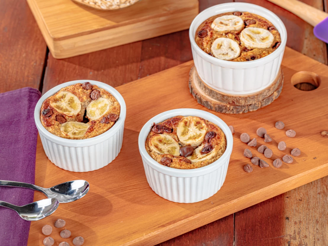 - Coloque em um ramequim, coloque o chocolate picado por cima e as rodelas de banana.