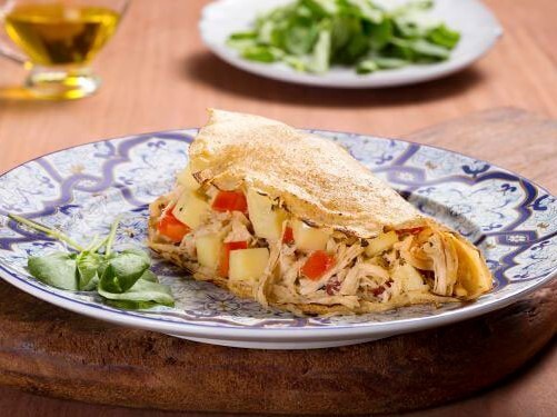 - Quando a panqueca estiver dourada, acrescente o frango, o tomate, o queijo e o orégano;