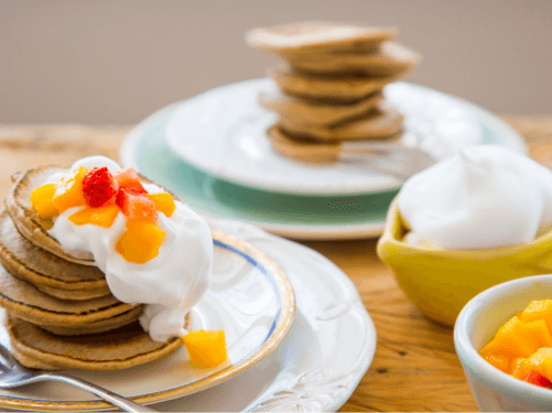 - Sirva as panquecas com o chantilly e com as frutas picadas.