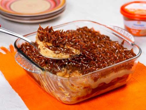 - Em um refratário faça camadas do creme, bolachas e doce de leite, deixando para finalizar com a cobertura;