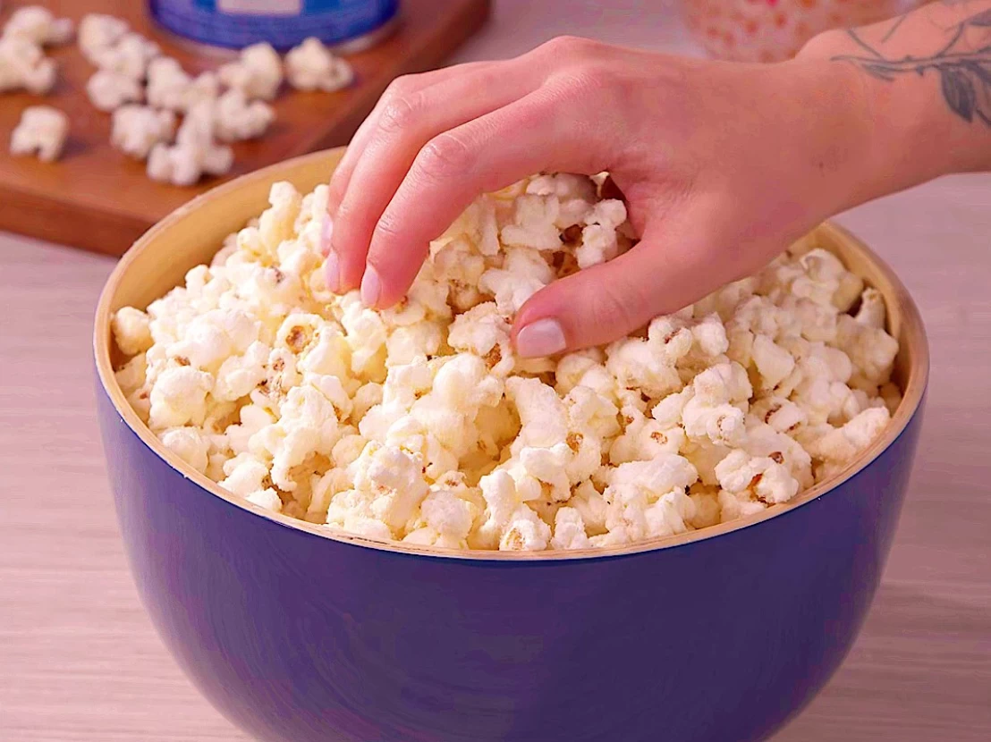 - Quando não se ouvir mais as pipocas estourando, desligue o fogo e despeje-as em um recipiente grande e fundo. Adicione o Leite em pó Integral Lata Piracanjuba sobre ela, misturando bem até que todas pipocas estejam cobertas do leite em pó;