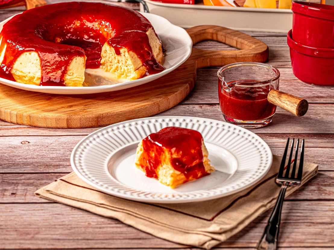 - Ao sair do forno, deixe esfriar e despeje a goiabada cremosa por todo o pudim de queijo.