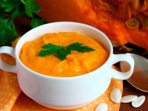 - Em uma panela, aqueça o azeite e refogue a cebola. Depois junte a abóbora amassada, a couve, o gengibre, o leite e cozinhe por alguns instantes e tempere com sal;