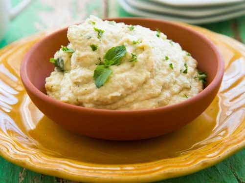 - Em um processador de alimentos ou liquidificador, bata a couve-flor com o leite do cozimento, o sal, o manjericão e a pimenta até obter um purê homogêneo. Sirva quente.