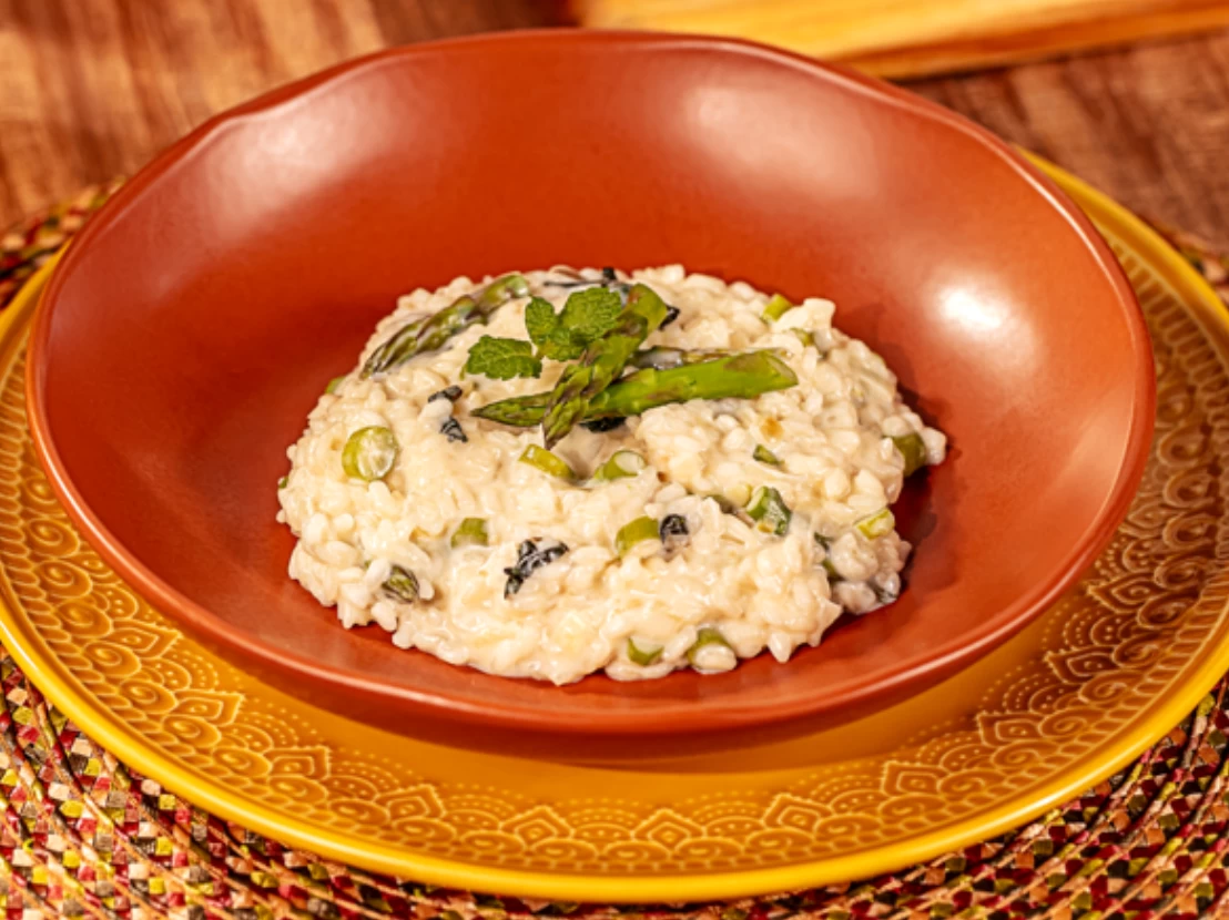 - Quando estiver quase seco (adicionada a última concha de leite), junte as pontas dos aspargos e cozinhe um pouco mais. Desligue o fogo, acrescente o parmesão, o sal e a hortelã. Sirva em seguida.