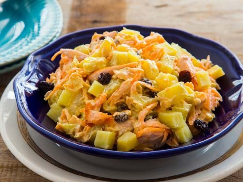 - Em um recipiente, misture delicadamente o salmão, a batata-doce, a cenoura, as uvas passas, o creme de leite, a mostarda, o azeite e o sal. Sirva frio.
