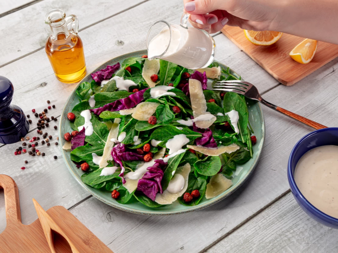 - Espalhe as folhas de radicchio, coloque o grão de bico crocante, o molho e se quiser acrescente algumas lascas de parmesão.