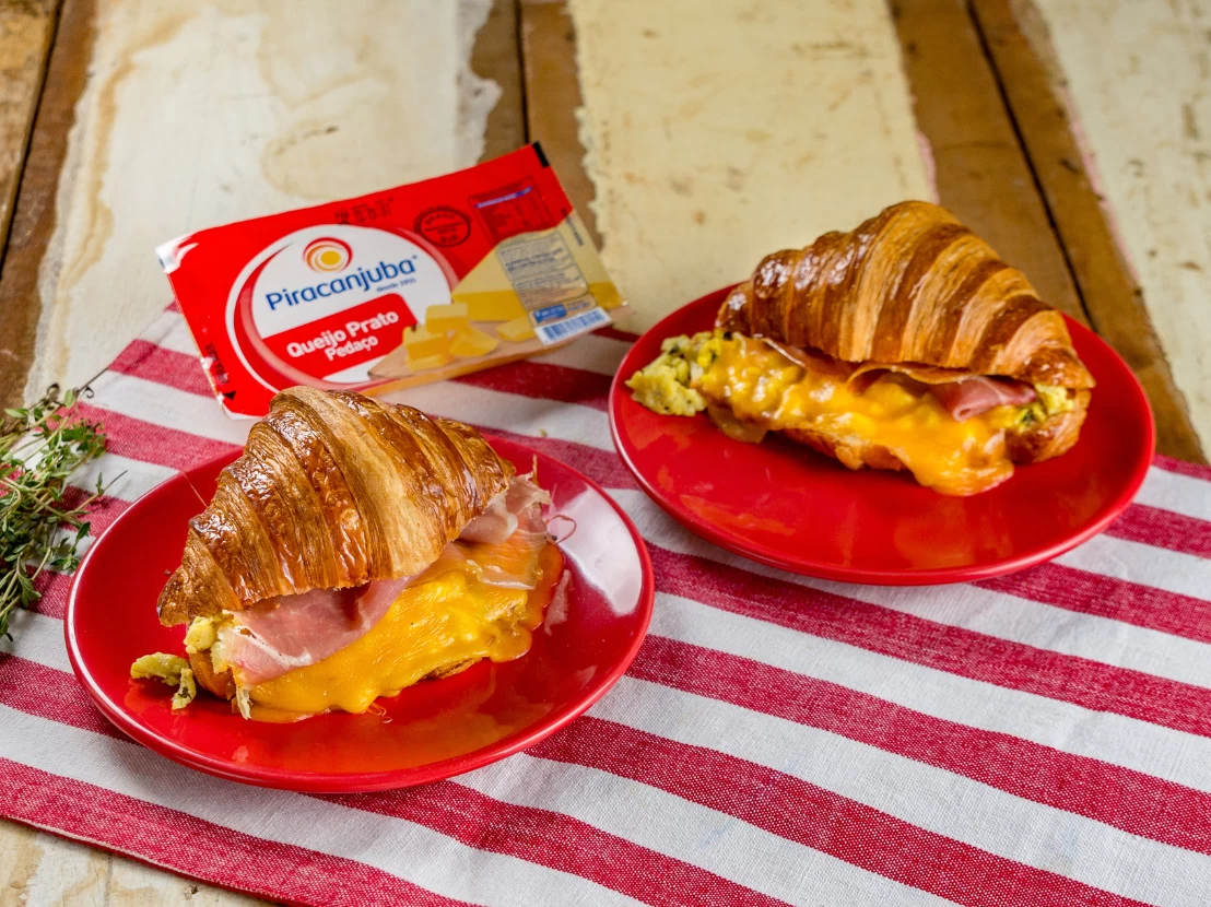 - Abra o croissant e acomode os ovos com queijo sobre a base com a ajuda de uma espátula; por cima, coloque a fatia de presunto e as folhas de agrião. Regue com mais azeite, tampe e sirva.