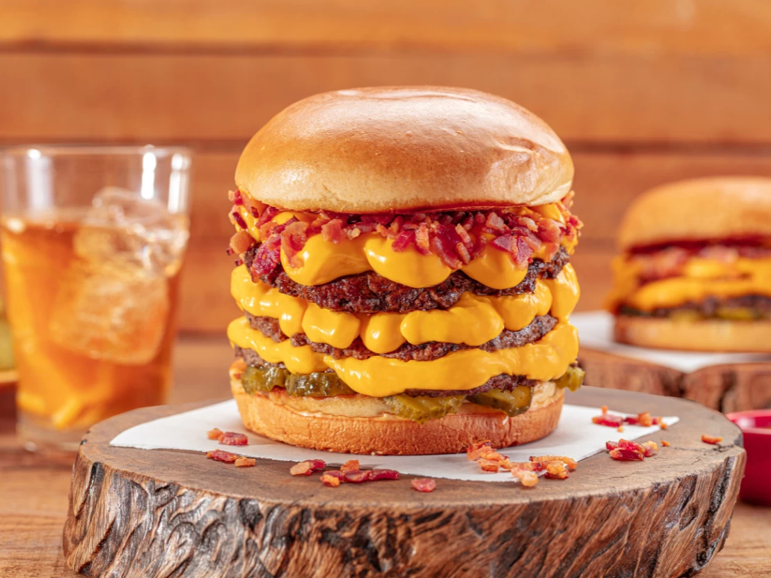 - Com as duas partes do pão já douradas, coloque o picles, um dos hambúrgueres, cheddar, hambúrguer e cheddar novamente. Por último, disponha as tiras de bacon.