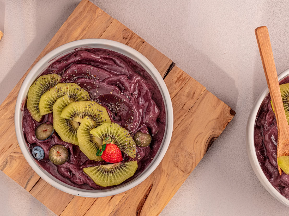 - Sirva no bowl com frutas de sua preferência (aqui, colocamos rodelas de kiwi e mirtilos).