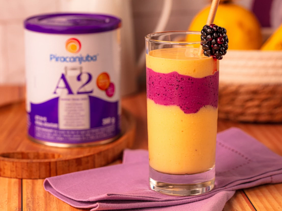 - Em um liquidificador comece batendo a água com Leite em pó A2 Piracanjuba, o açúcar e os mirtilos e amoras. Reserve na geladeira.
