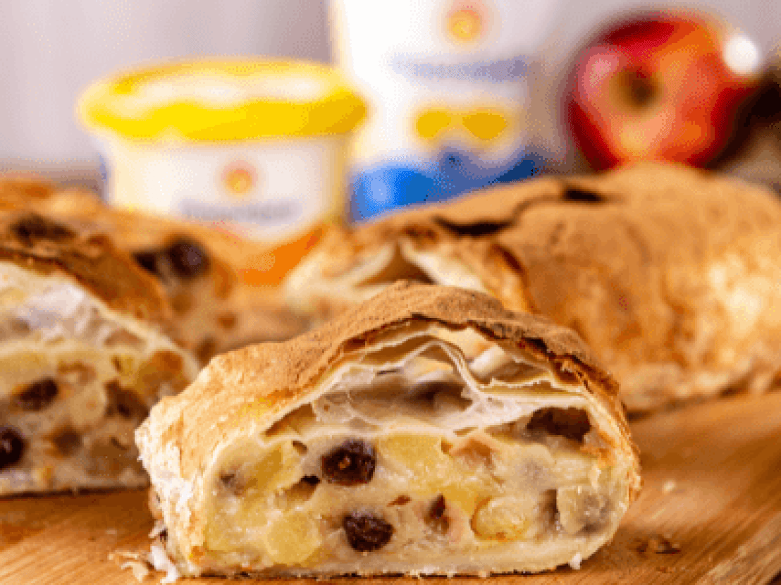 - Você pode escolher fazer uma peça de tamanho grande ou fazer 2 strudels de tamanho menor. Fica a sua escolha.