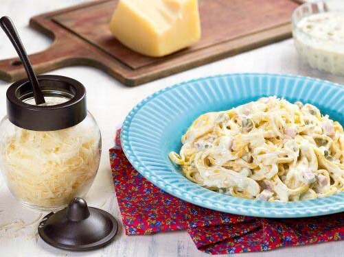 - Sirva a massa e coloque um pouco de molho em cima, finalizando com queijo parmesão.