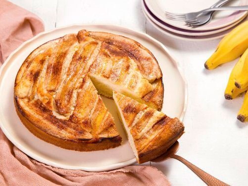 - Coloque a mistura em uma assadeira untada e enfarinhada. Decore com as fatias de banana por cima. Polvilhe açúcar e canela a gosto;