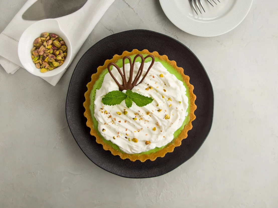 - Decoração: Pistache picado, folhas de hortelã, chocolate meio amargo derretido
