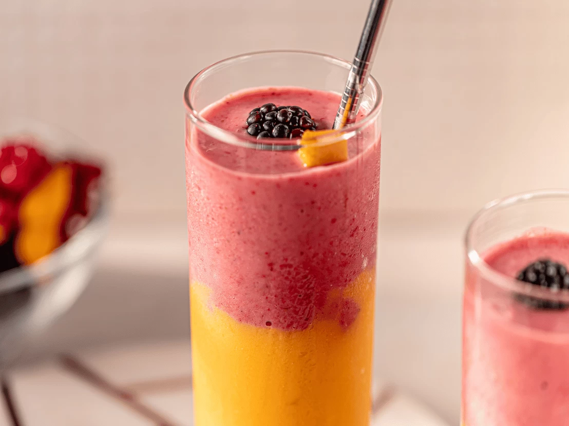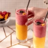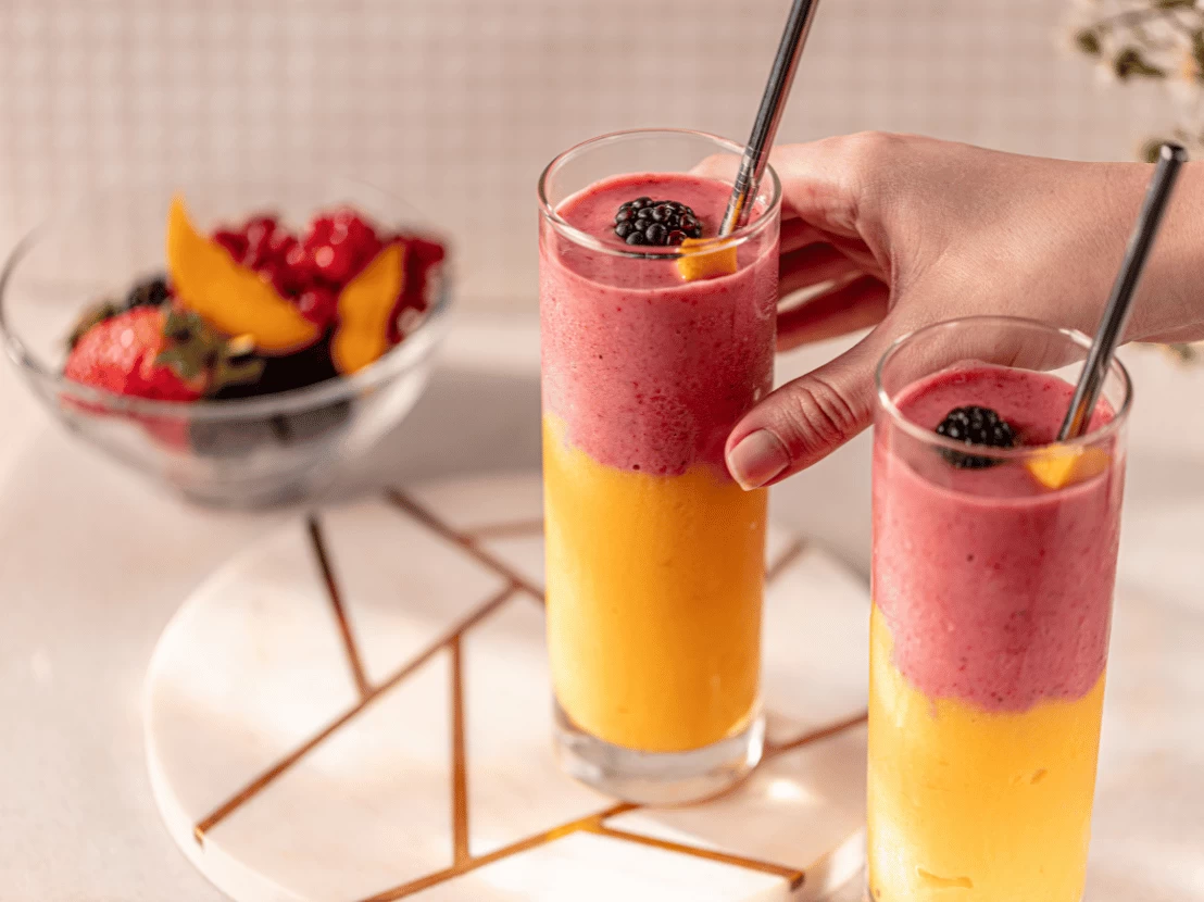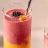 - Sirva no copo as duas vitaminas para que apareça as duas cores. Decore com frutinhas.